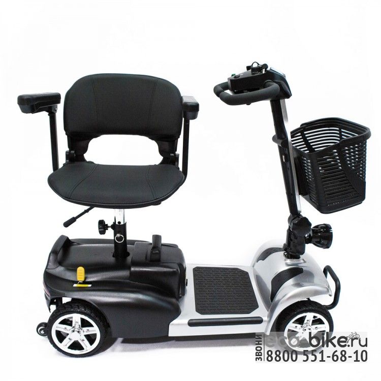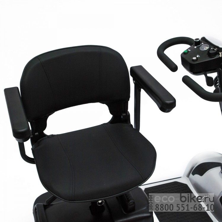 Одной из ключевых особенностей MET EXPLORER 250 является удобное поворотное сиденье с откидывающимися подлокотниками, что значительно упрощает посадку и высадку для людей с ограниченной подвижностью. Мотоциклетный руль с рукоятками управления интуитивно понятен и надёжен, а прочная четырёхколёсная база придаёт скутеру стабильность даже на неровных поверхностях.